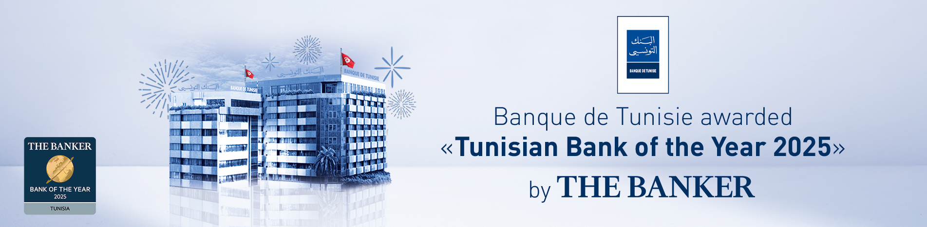 15 DÉC Le Prix « Bank of the Year » une autre distinction pour la BT en 2025 24 NOV جائزة أبو القاسم الشابي للبنك التونسي تبوح بنتائجها تتويج كاميليا عبد الفتاح من مصر والجائزة التقديرية لعالم الاجتماع الطاهر لبيب 17 OCT Lancement de la campagne BT avec le groupe STAFIM (Peugeot, Opel et Citroën). 13 OCT القائمة الطويلة لجائزة "أبو القاسم الشابي/ البنك التونسي" للأدب العربي الدورة 2025 الخاصة بالرواية العربية 14 JUIL La Banque de Tunisie obtient la certification MSI 20000® 16 JUIN Plus qu’un voyage, un retour accompagné 4 JUIN Communiqué de presse 14 MARS Découvrez la Nouvelle Version de l'Application Mobile « BT MOBILE » de la Banque de Tunisie : Une Expérience Utilisateur Révolutionnée 14 MARS جائزة أبو القاسم الشابي/ البنك التونسي 30 JANV Pack LIBERTE PRO 31 DÉC Suspension de la distribution des carnets de chèques selon l'ancienne formule 29 NOV جائزةِ أبو القاسم الشابي 16 OCT جائزة «أبو القاسم الشابي»: الإعلان عن القائمة الطويلة، وتنظيم ندوة قبيل موعد الكشف عن المتوجين 4 SEPT Crédits frais d'installation 10 JUIN Pack Diamant 9 MAI Offre promotionnelle « Crédit à l’habitat » 2 AVR جائزة أبو القاسم الشابي/ البنك التونسي 21 MARS Crédit avance SAHA 1 SEPT Inscription scolaire en ligne Paiement en ligne des frais des inscriptions scolaires 24 MARS Appel à candidature au poste d’Administrateur Indépendant 2 FÉVR Nouvelle version de BTNET est disponible maintenant. 19 AVR La Banque de Tunisie adopte Sopra Banking Platform pour son nouveau core banking 27 JUIL Pack BT Etudiants 19 JANV Digitalisation des demandes de crédits... 27 SEPT Du nouveau pour la carte jeunesse de la Banque de Tunisie 30 DÉC La Banque de Tunisie lance la campagne de mise à jour des données de sa clientèle 2 OCT Votre agence BT El Ghazela change d'adresse pour mieux vous servir. 1 SEPT La Banque de Tunisie met en place un système de sécurité basé sur le protocole 3D SECURE Le Prix « Bank of the Year » une autre distinction pour la BT en 2025 جائزة أبو القاسم الشابي للبنك التونسي تبوح بنتائجها تتويج كاميليا عبد الفتاح من مصر والجائزة التقديرية لعالم الاجتماع الطاهر لبيب Lancement de la campagne BT avec le groupe STAFIM (Peugeot, Opel et Citroën). القائمة الطويلة لجائزة "أبو القاسم الشابي/ البنك التونسي" للأدب العربي الدورة 2025 الخاصة بالرواية العربية La Banque de Tunisie obtient la certification MSI 20000® Plus qu’un voyage, un retour accompagné Communiqué de presse Découvrez la Nouvelle Version de l'Application Mobile « BT MOBILE » de la Banque de Tunisie : Une Expérience Utilisateur Révolutionnée جائزة أبو القاسم الشابي/ البنك التونسي Pack LIBERTE PRO Suspension de la distribution des carnets de chèques selon l'ancienne formule جائزةِ أبو القاسم الشابي جائزة «أبو القاسم الشابي»: الإعلان عن القائمة الطويلة، وتنظيم ندوة قبيل موعد الكشف عن المتوجين Crédits frais d'installation Pack Diamant Offre promotionnelle « Crédit à l’habitat » جائزة أبو القاسم الشابي/ البنك التونسي Crédit avance SAHA Inscription scolaire en ligne Paiement en ligne des frais des inscriptions scolaires Appel à candidature au poste d’Administrateur Indépendant Nouvelle version de BTNET est disponible maintenant. La Banque de Tunisie adopte Sopra Banking Platform pour son nouveau core banking Pack BT Etudiants Digitalisation des demandes de crédits... Du nouveau pour la carte jeunesse de la Banque de Tunisie La Banque de Tunisie lance la campagne de mise à jour des données de sa clientèle Votre agence BT El Ghazela change d'adresse pour mieux vous servir. La Banque de Tunisie met en place un système de sécurité basé sur le protocole 3D SECURE